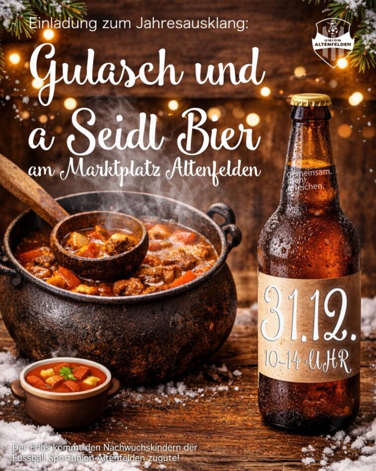 am Markplatz Altenfelden Einladung zum Jahresausklang: 📅 31. Dezember 2025🕙 10-14 Uhr📍 Marktplatz Altenfelden🍺 Seidl, Spritzer, Tee m. Schuss, Anti🍲 Gulasch🥳 Gute Laune 🙌 Wir freuen uns auf euer Kommen! 🥳🙌 UA59 | gemeinsam.mehr.erreichen.